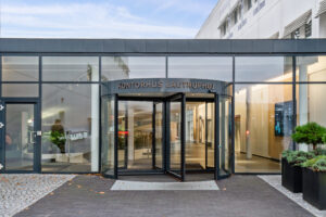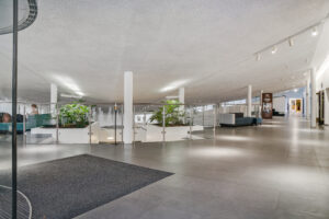 Lejemålene entreres via et fælles indgangsparti af glas, hvorfra man imødekommes af åben og indbydende foyer. Førsteindtrykket er vigtigt, og derfor er der også kræset for detaljerne med hyggelige loungemøbler, grønne planter og – til de førstegangsbesøgende – en elektronisk infotavle, der giver dine gæster et komplet og hurtigt overblik over ejendommen, dets lejere og dagens møder.
