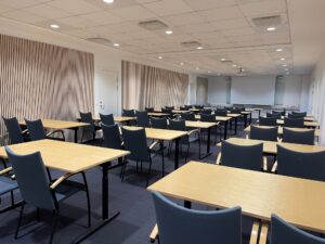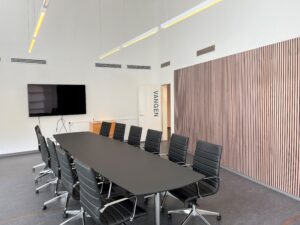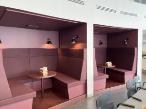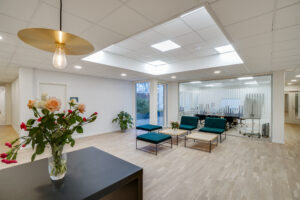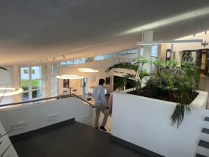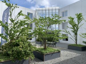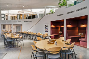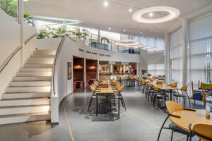 Fra foyeren, der også fungerer som knudepunkt for de tre kontorblokke, finder man ligeledes ejendommens fælles kantine og mødecenter. Fra kantinen er der direkte udgang til husets grønne gårdhave og hyggekroge.